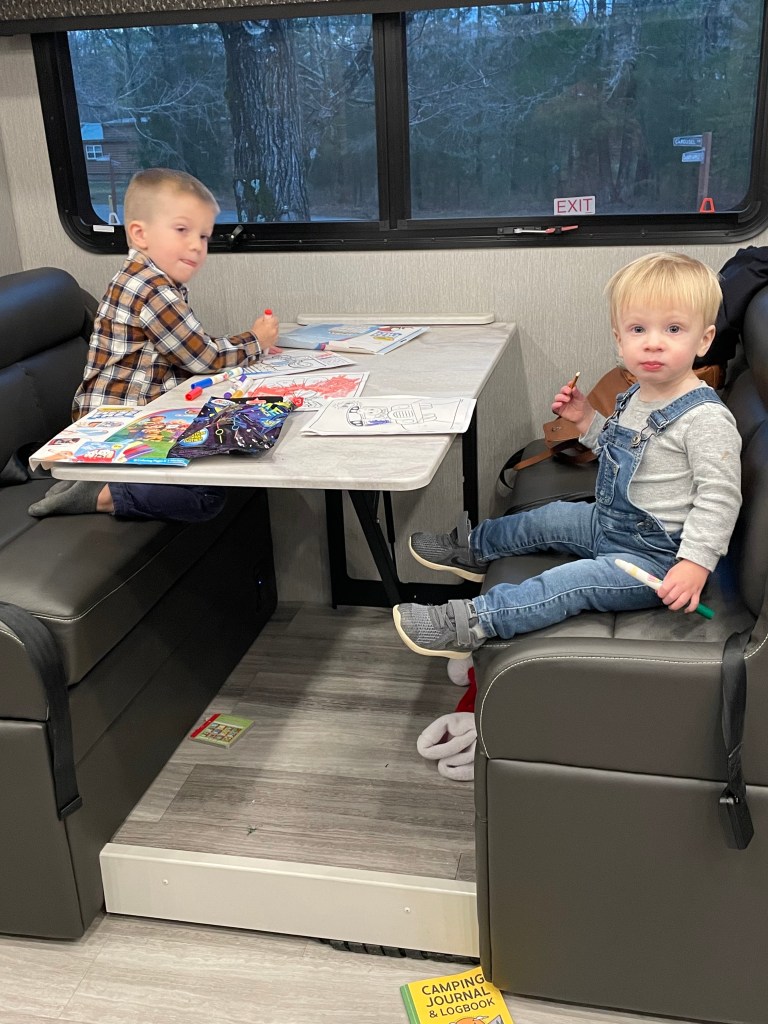 Ample sleeping space, full size fridge, and bathroom space were priorities for us. Right now our little boys get the bunk beds and we installed cargo netting to prevent falls (which works…I forgot to put it up one night and sure enough Jace rolls right out). Our older kids share the drop down queen; so far there are no issues, but the kitchen booths can turn into a bed, and Eli has no problem falling asleep in one of the recliners. There ARE options!